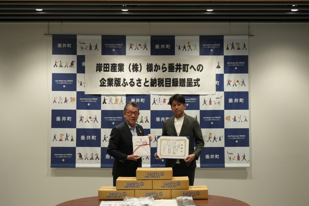 企業版ふるさと納税として岐阜県垂井町に非常用トイレ10,000回分を寄附しました。それに伴いまして、垂井町長より直接、弊社代表の岸田卓磨が感謝状を頂戴いたしました。